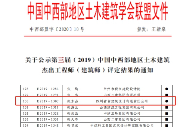 2020年8月24日,四川省土木建筑學(xué)會(huì)發(fā)表中國(guó)中西部地區(qū)土木建筑杰出工程師、建筑師名單。我院張東山院長(zhǎng)榮獲“中國(guó)中西部地區(qū)土木建筑杰出建筑師”。